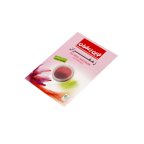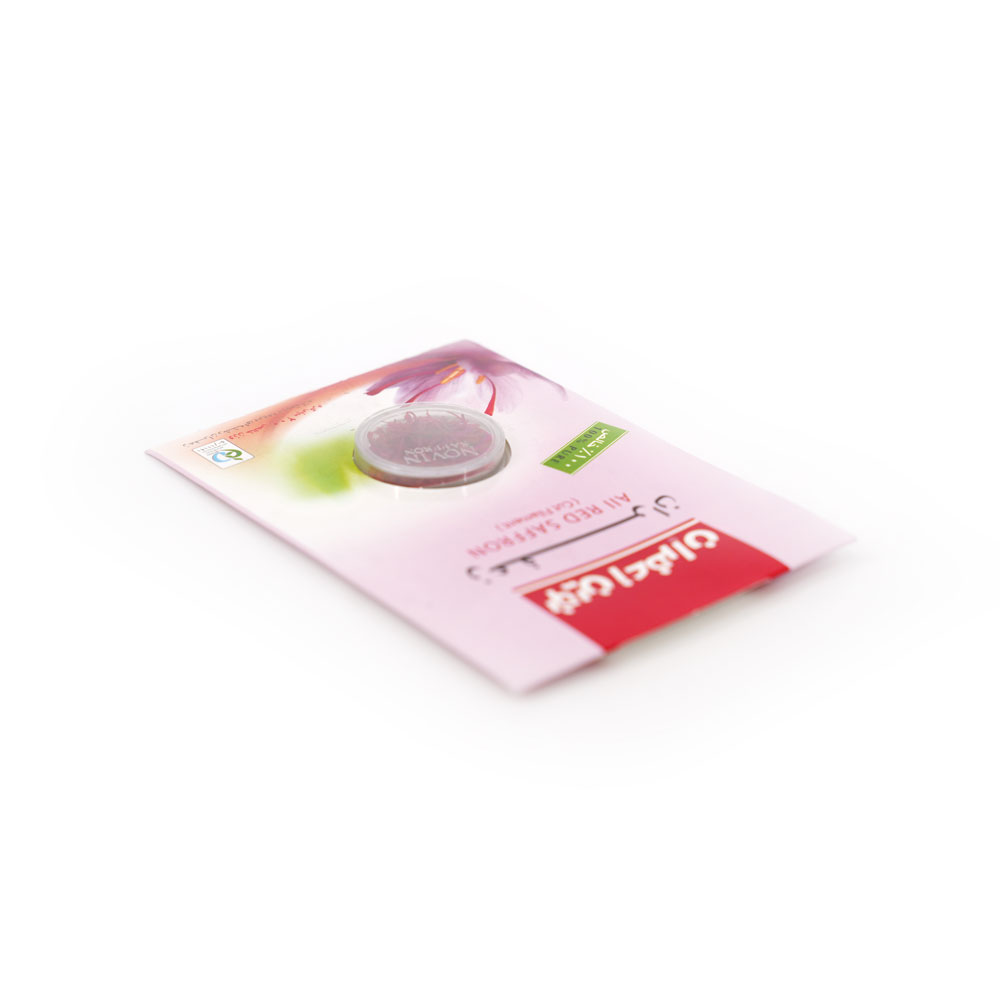 زعفران سرگل خالص با وزن 0.2 میلیگرم ، در بستهبندی کارتی همراه با محفظه دایرهای داخلی؛ ترکیبی از طراحی زیبا و کاربردی برای استفاده روزمره.